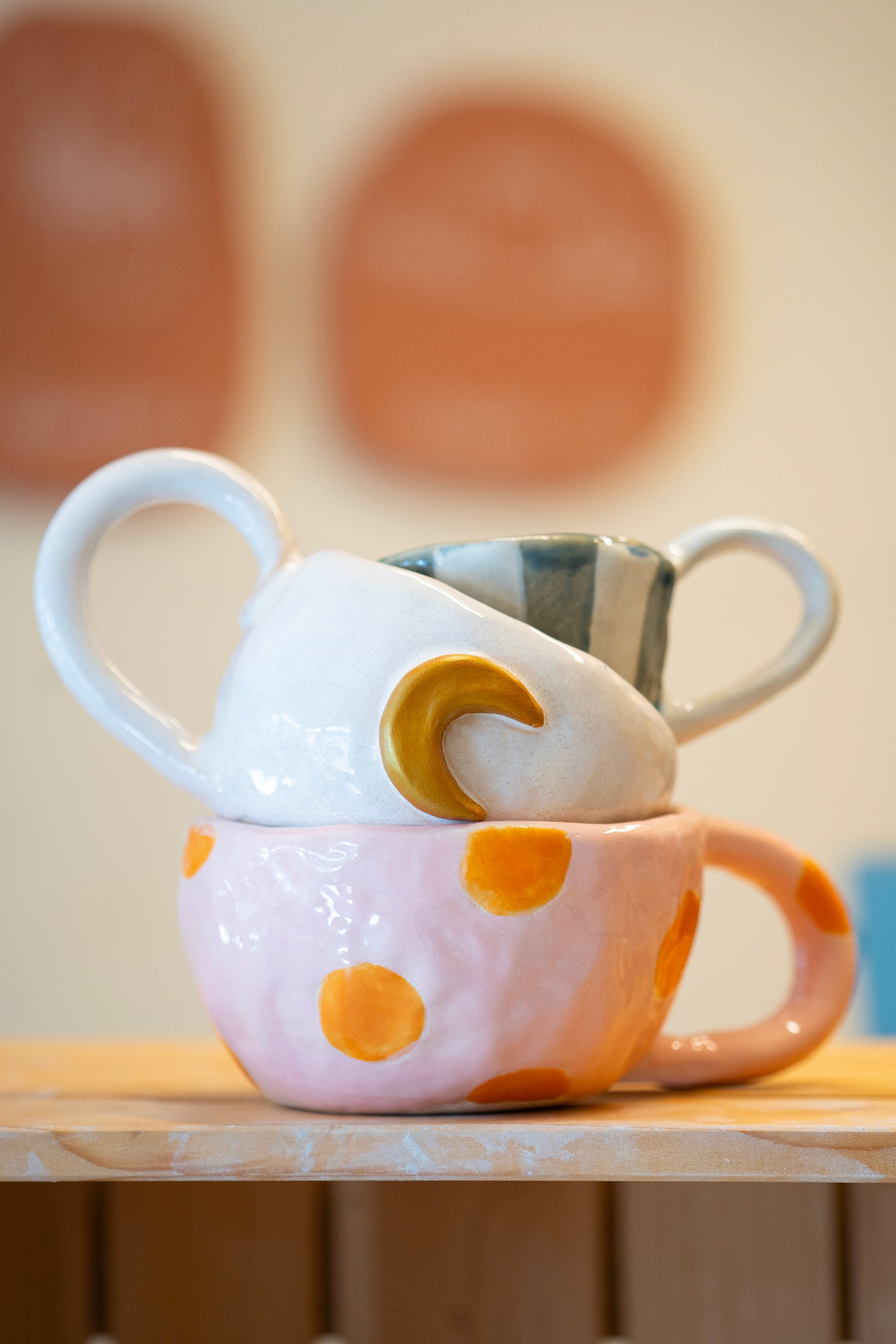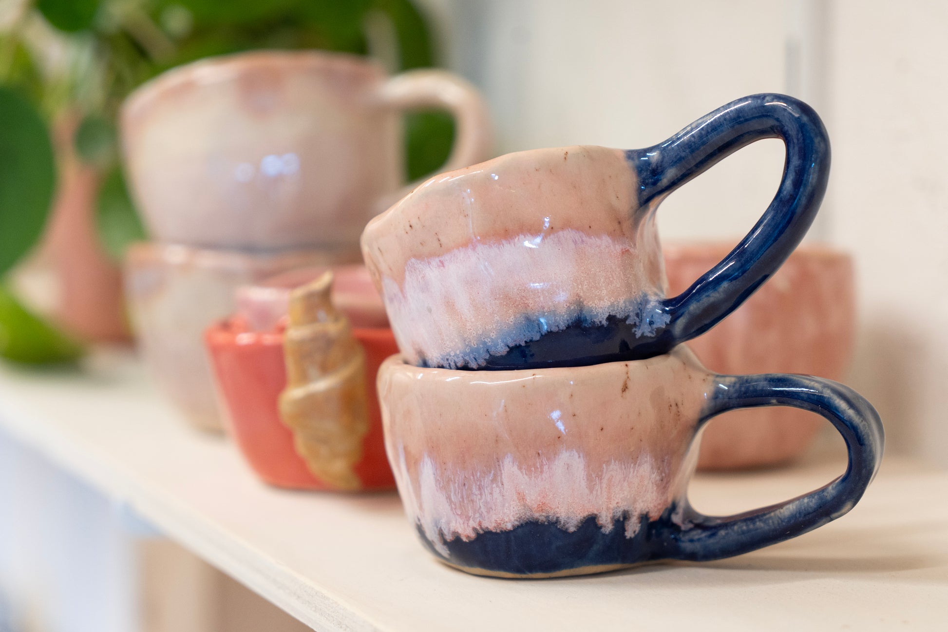 De mokken blijven nog even achter bij KLEILOKAAL voor de tweede stook: de glazuurstook. Zodra de mokken gebakken zijn kun je ze ophalen bij KLEILOKAAL.