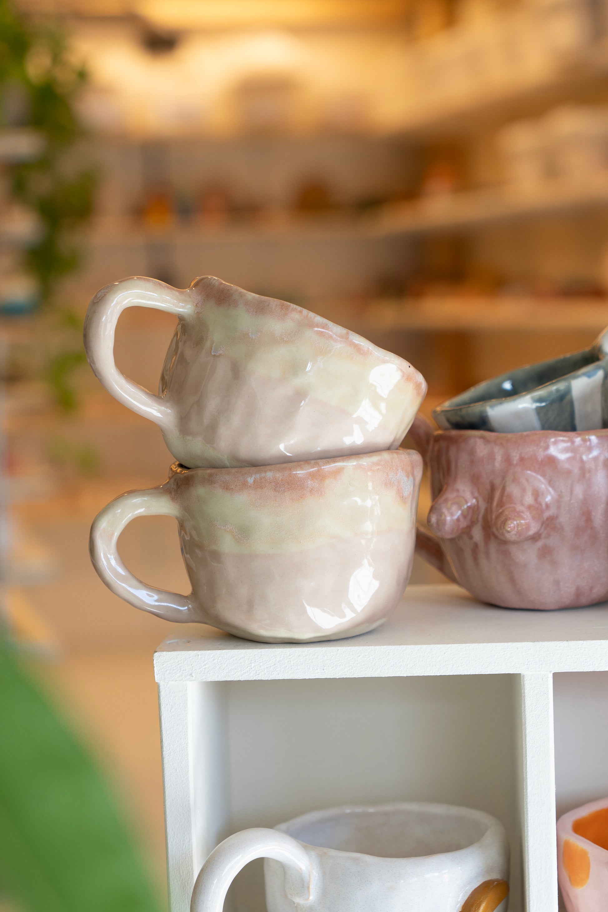 Deze workshop bevat handvormtechnieken (als je graag met de draaischijf aan de slag wil, kijk dan bij de workshop pottenbakken) en dat kun je ook zien: handgemaakt keramiek heeft vaak een kenmerkend uiterlijk. In deze workshop kun jij dat uiterlijk bepalen, want je gaat alles zelf maken: van een bol klei vorm je een kommetje, je maakt een oor in de vorm die jij leuk vindt, je kunt eventueel nog reliëf-decoratie toevoegen aan je mok en dit alles doe je niet één keer, maar je maakt zelfs 2 mokken! Of je dit tot een gelijkend setje probeert te maken of dat je lekker experimenteert met 2 verschillende stijlen is aan jou.